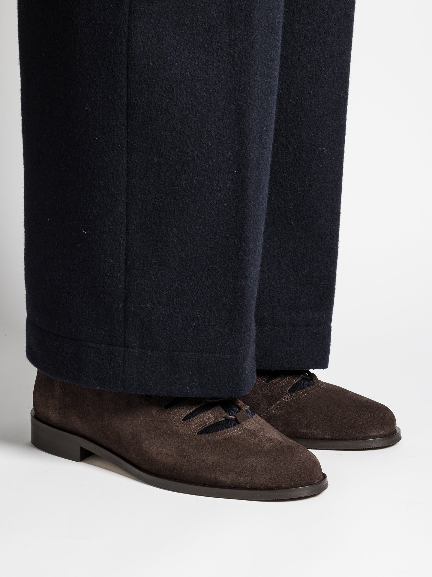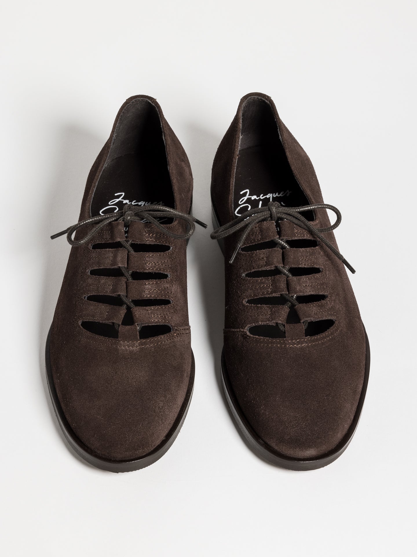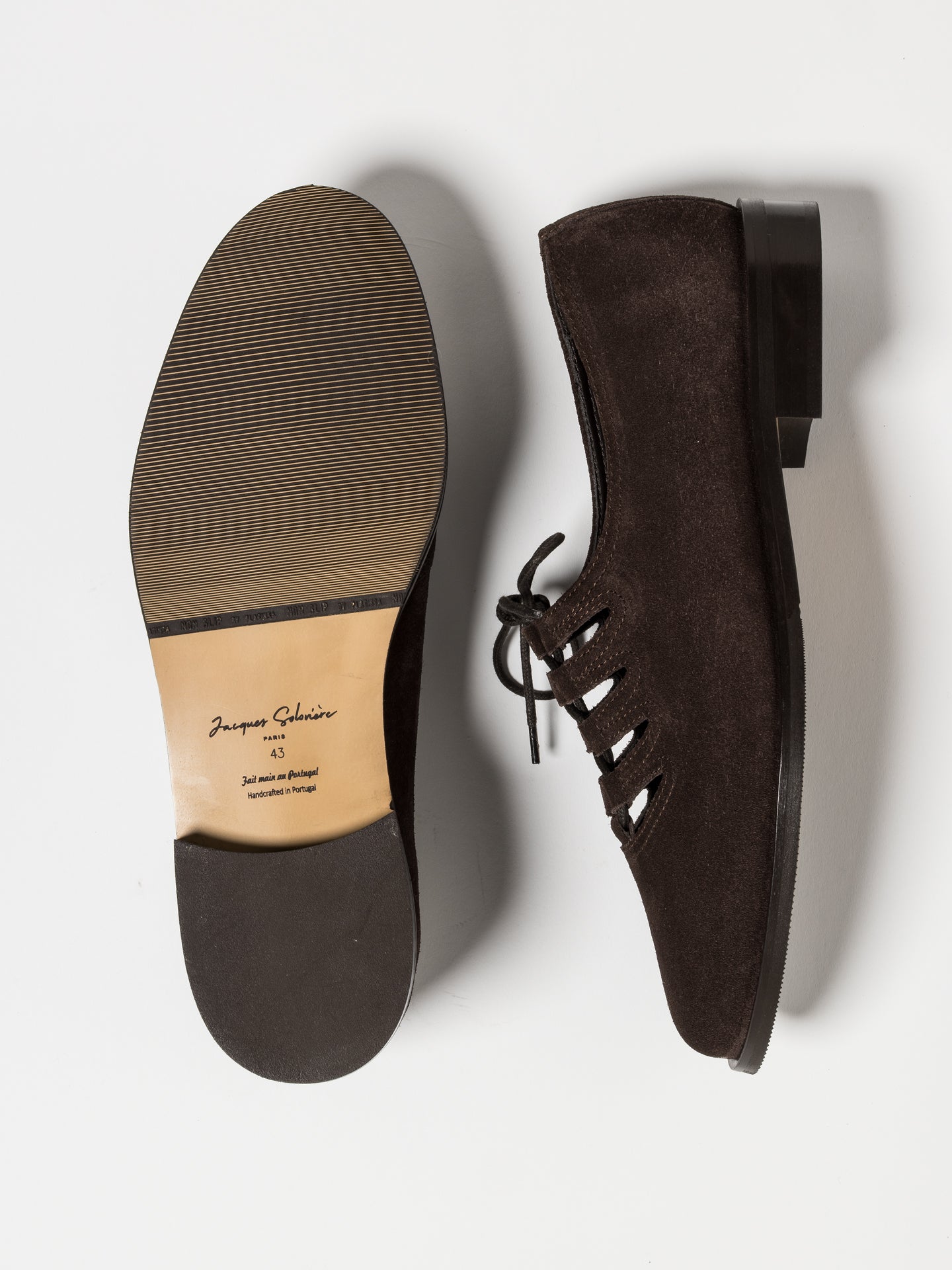 Steve Suede Mogano is a new update version of Jacques Solovière Paris's first unisex derby, crafted from big grained leather in a one piece design. All our shoes are produced in limited numbers.