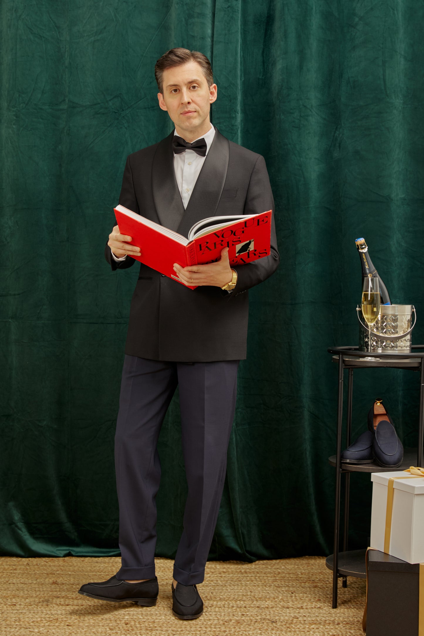 A classic black tuxedo with matching trousers featuring grosgrain details, paired with a white tuxedo shirt and grosgrain tie, is the perfect way to elevate this shoe. For a daring twist, choose a white single-breasted shawl lapel jacket, a black grosgrain bow tie, and a black tuxedo shirt to accentuate the formal look.