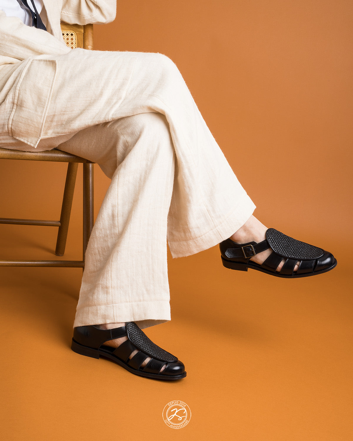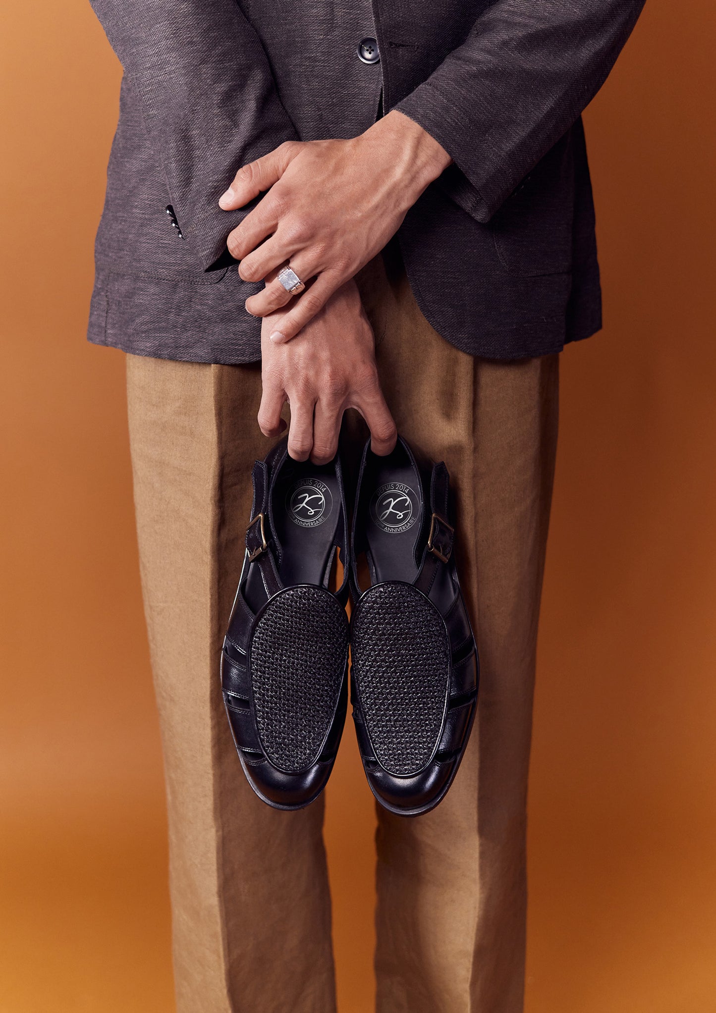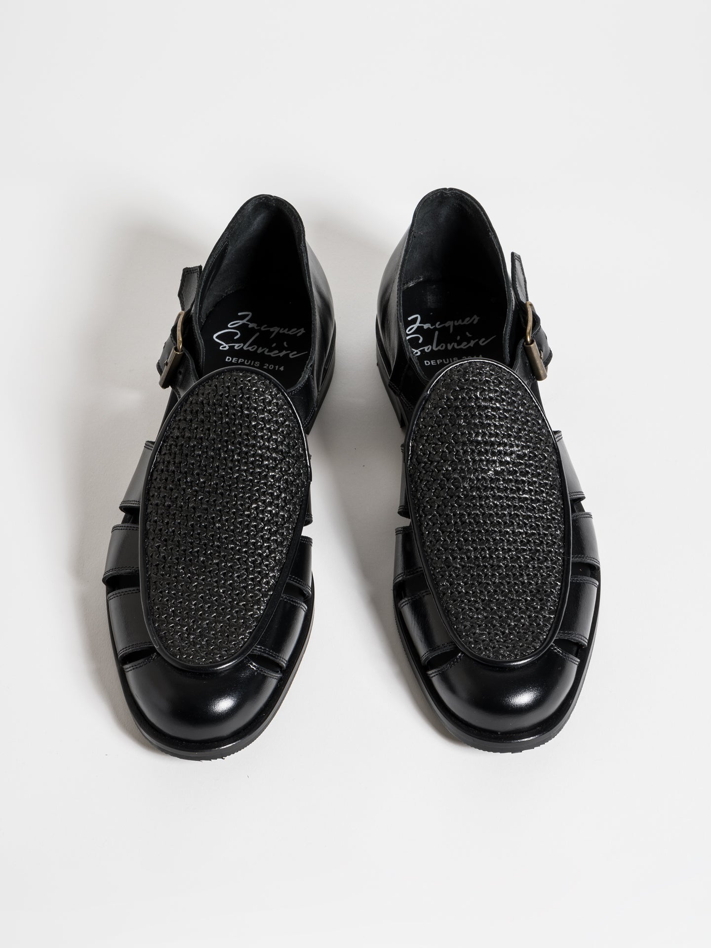 Regular price €177,00Jacques Solovière's Fisherman sandals in bi-materials combine the classic charm of black leather with the unique texture of woven raffia fabric. These elegant sandals offer a contemporary twist in design, inspired by our signature Lex loafer. The Franck sandal redefines the codes of Fisherman sandals, blending durability and breathability. With their black leather straps and intricately woven raffia detailing, they exude both sophistication and casual elegance, making them a versatile choice for various occasions. Whether strolling along the beach or exploring the city streets, these sandals promise comfort and style in equal measure.