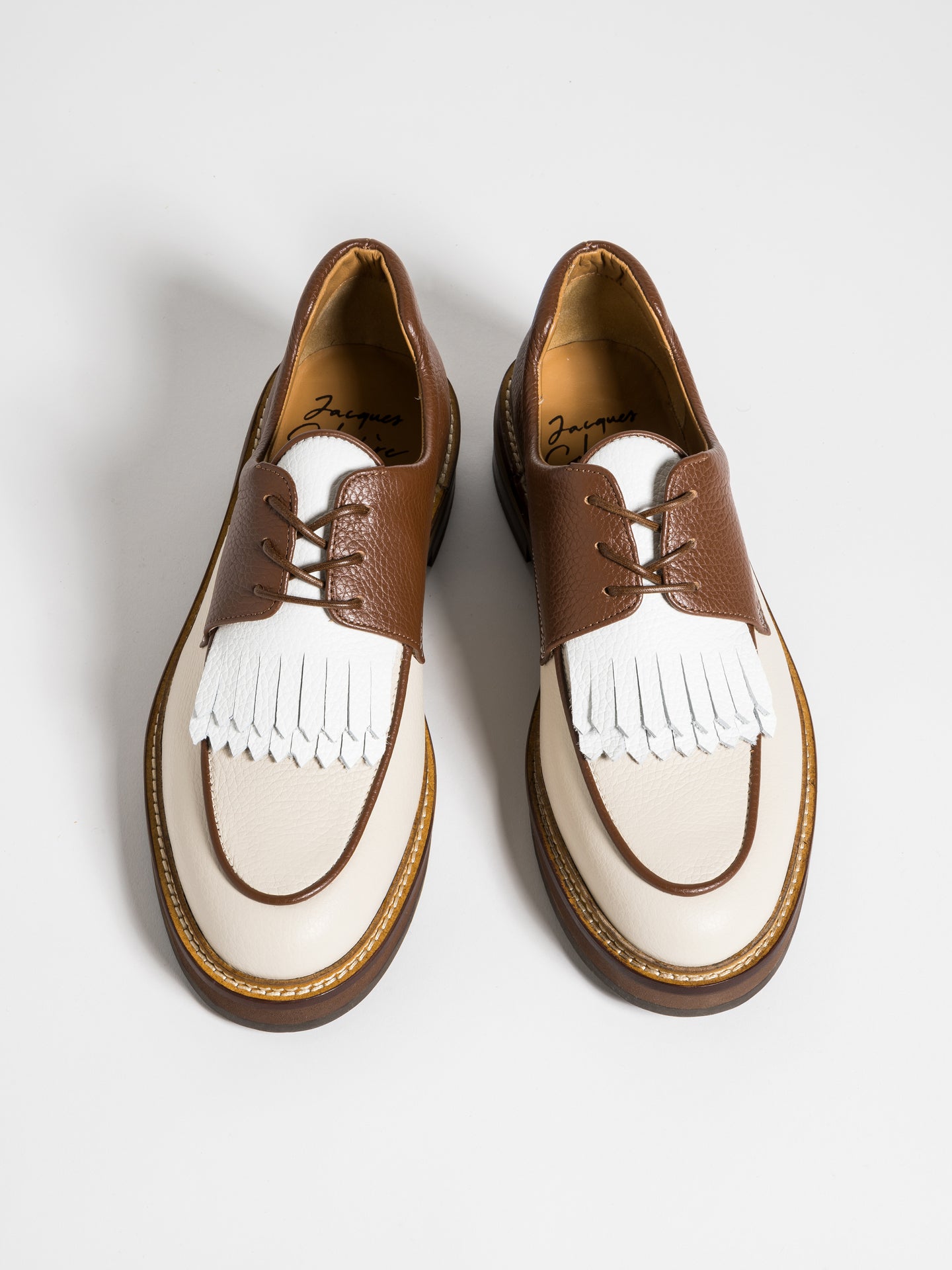 Regular price €237,00Jacques Solovière golf shoes combine the elegant appearance of derbies with the performance of traditional golf shoes. Made from grained leather and adorned with contrasting fringes, they offer both style and comfort. The spikeless molded soles ensure a firm grip and stability on the green, making them the ideal choice for combining style and performance.