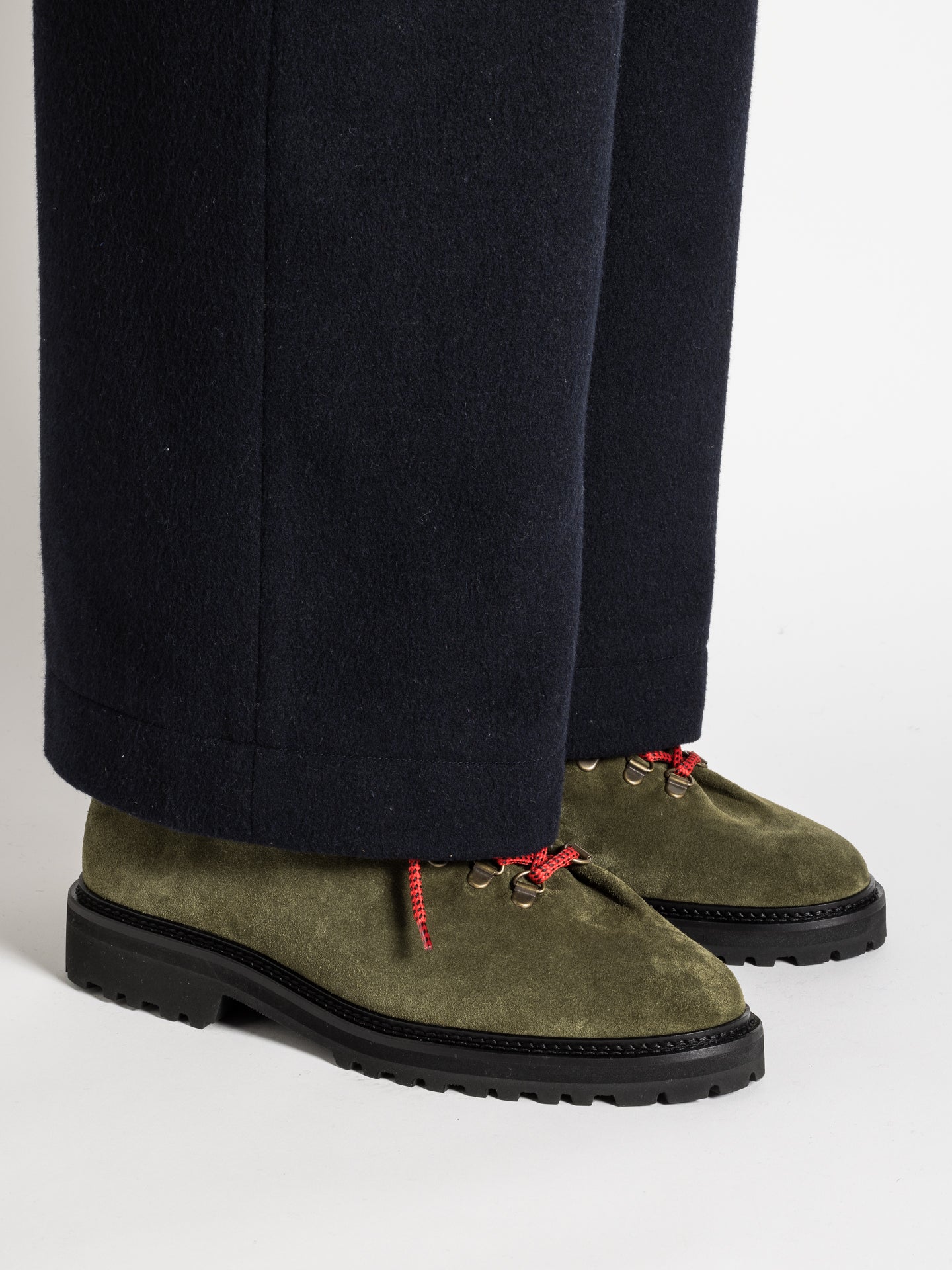 Regular price €297,00These khaki suede derby shoes, inspired by mountain footwear, embody the authentic and timeless style of Jacques Solovière. Crafted from premium Italian suede, they feature bold red rope laces inspired by hiking boots, adding a modern and daring touch. Gold-toned metal eyelets and a black lug rubber sole provide durability and comfort, perfect for urban adventures or outdoor escapes. Versatile and elegant, these shoes pair effortlessly with both casual and more formal outfits.