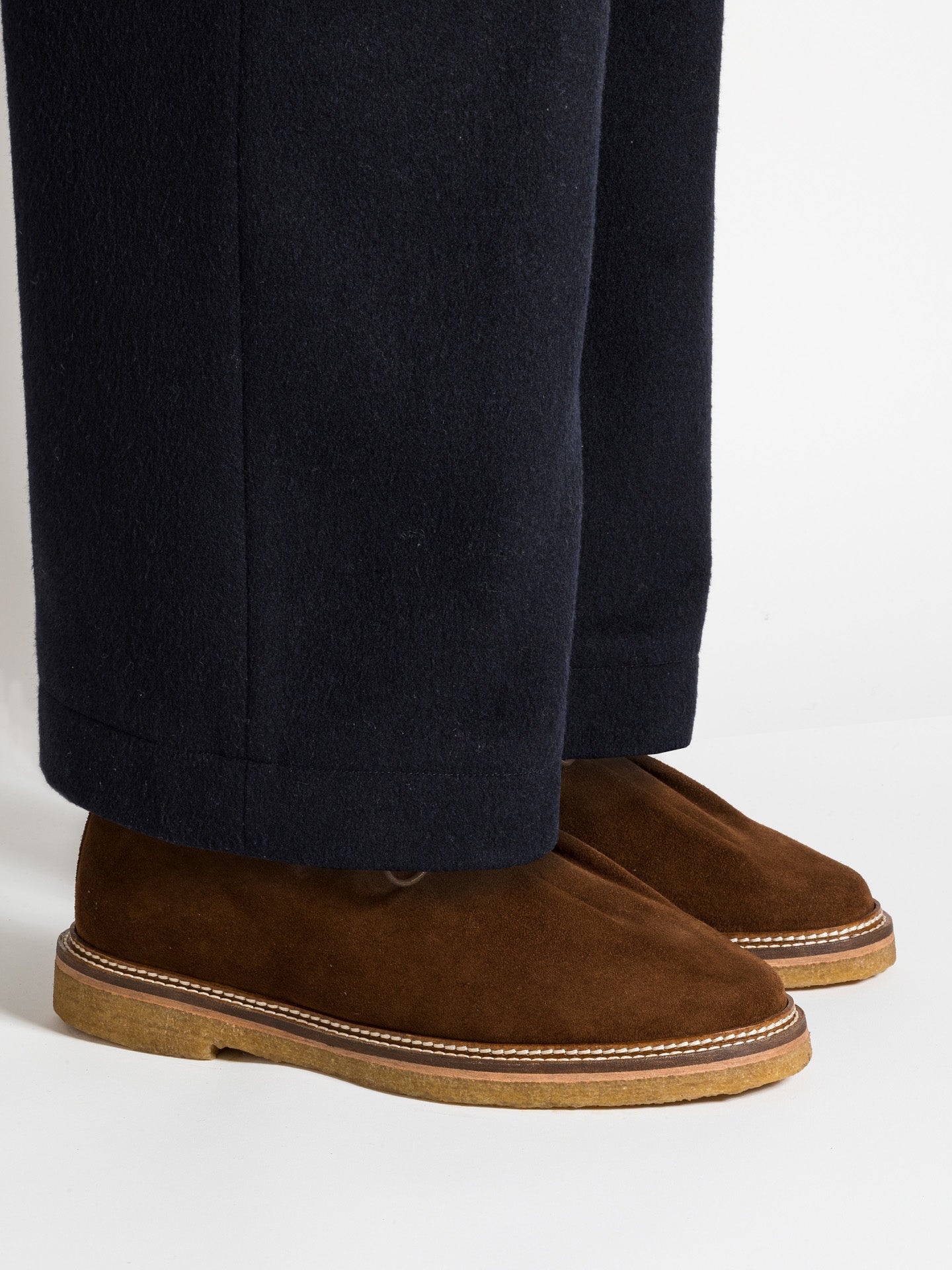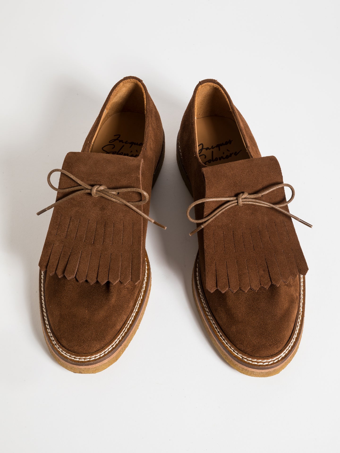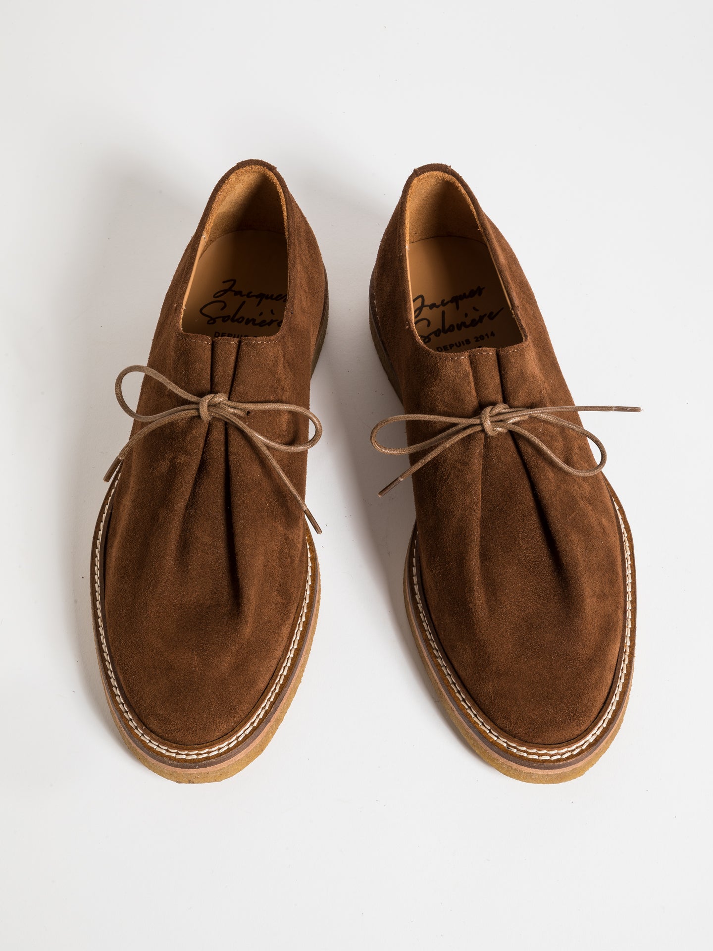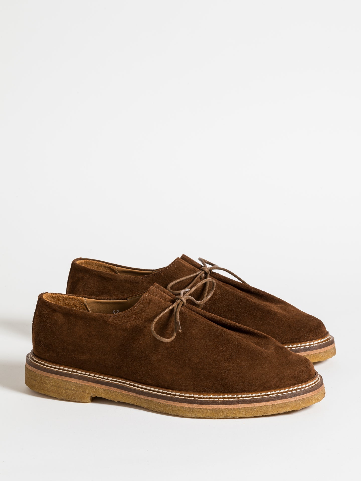The Ray Brown is now one of our bestselling models, this silhouette is inspired by men’s tailoring. Articulated in tobacco suede, its supple gathered tongue, thick laces, and natural rubber sole encapsulate comfort and style.