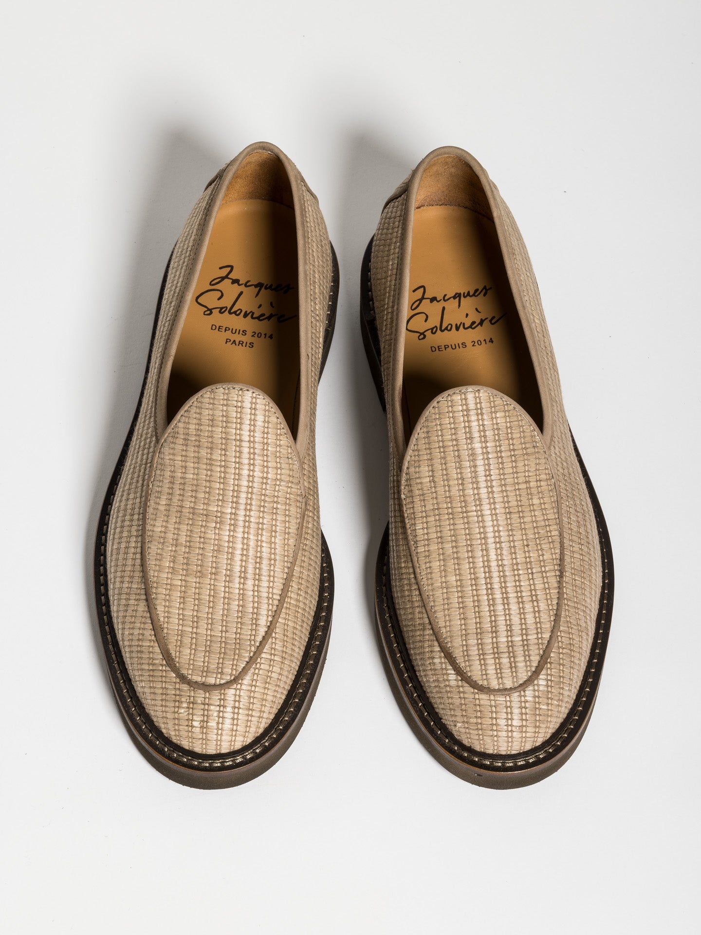 The perfect summer loafers, this Lex pair is woven from raffia in an elegant taupe shade, offering a relaxed yet refined profile. They are fitted with lightweight taupe PU soles featuring our stamped logo underneath, combining comfort with a distinctive signature detail.